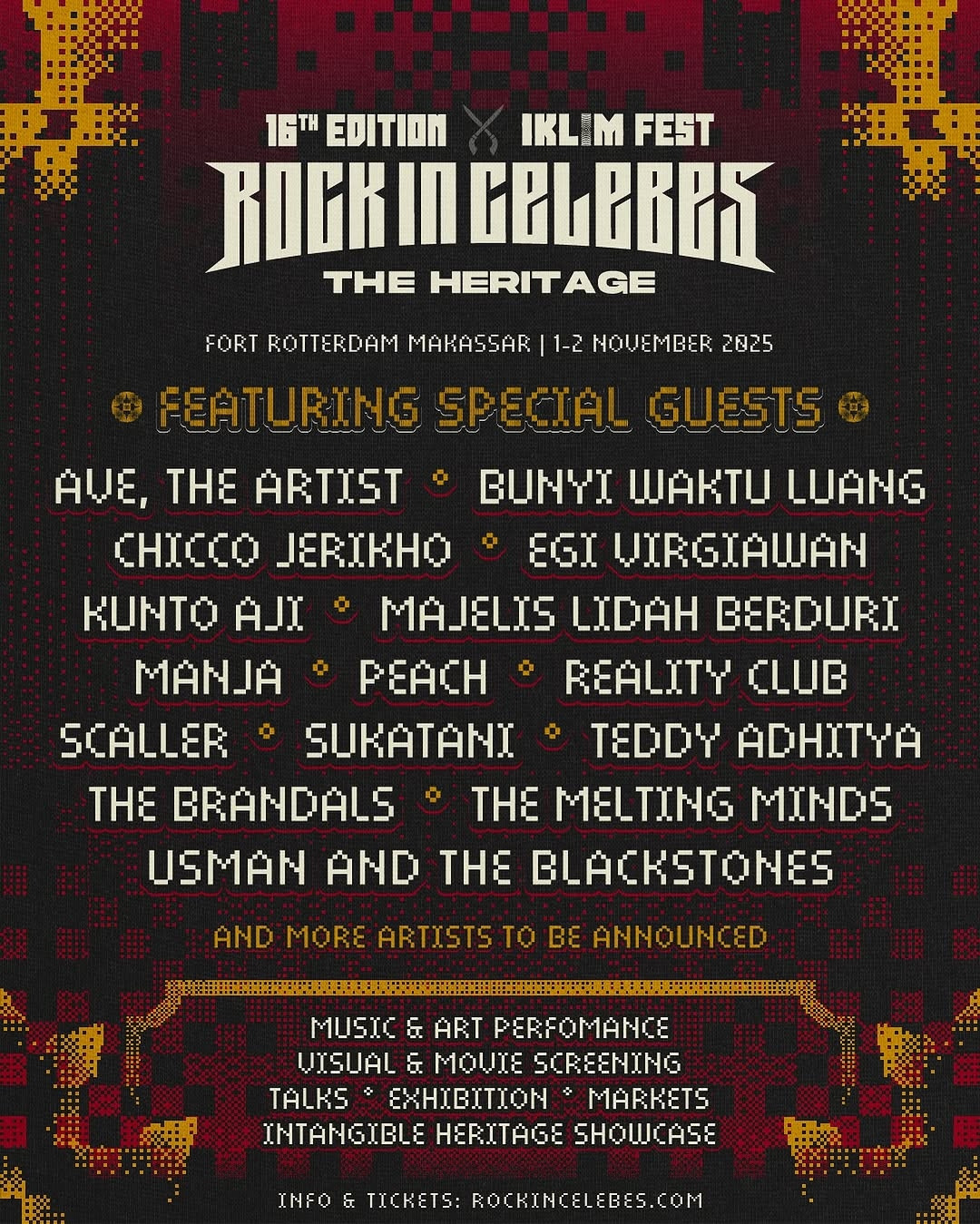 Bersama Iklim Fest 2025, Rock In Celebes kembali hadir di lokasi cagar budaya ikonik Makassar, Fort Rotterdam, pada 1-2 November 2025. Menampikan ragam program dan pertunjukan dari puluhan artis/musisi/band tamu.